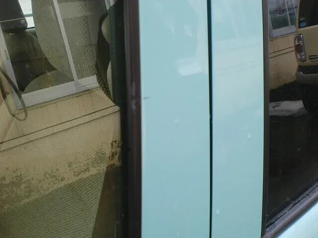 さらに、助手席側ピラーとドアモールにも軽度のキズとへこみが確認されたため、パーツ交換と塗装修理の両方を行います。