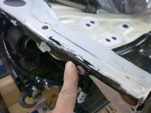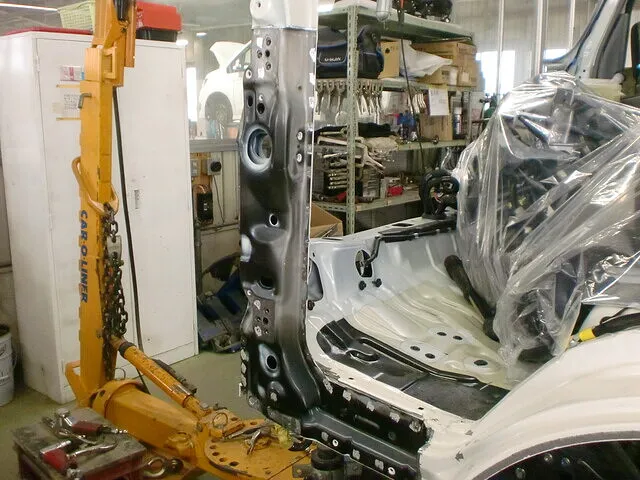 キャビン下部フレームには明らかなズレや変形があり、修正機を使用した骨格修正作業を実施。