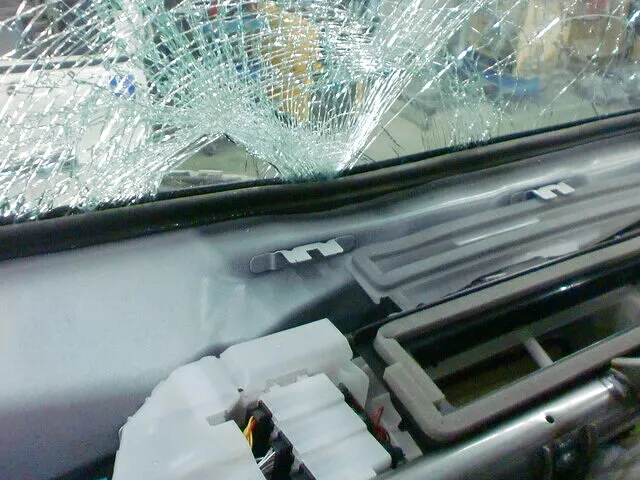 受入時点でフロントガラスは完全に破損し、フロントパネルは変形。