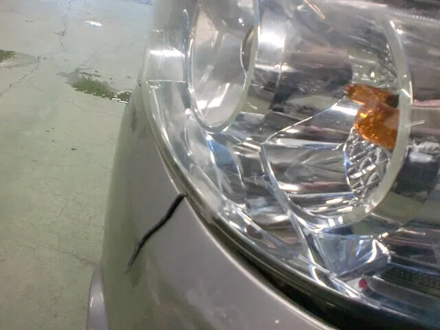 今回のお車は、フロント左側を中心に損傷を受けており、外観上でもバンパーやフェンダーの変形、ヘッドライトまわりのズレが確認できる状態でした。