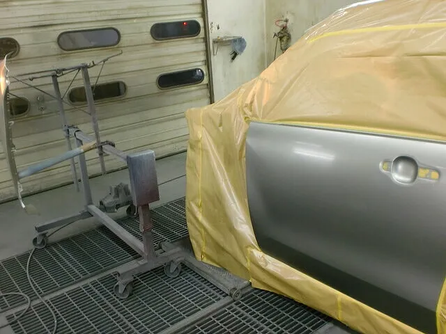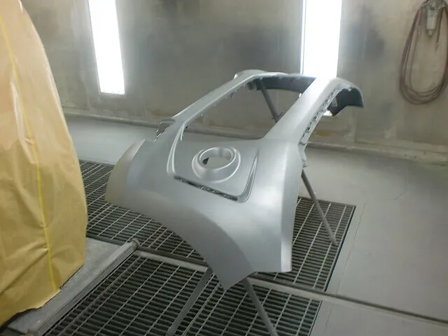 交換したフロントフェンダーやバンパーは、メーカー供給時には未塗装または下地塗装の状態のため、専用の塗装ブースにて塗装を実施。