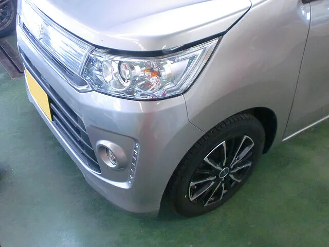 スズキ ワゴンR スティングレーのフロント周り事故修理にて、フロントバンパー交換・フロントフェンダー交換を行いました。